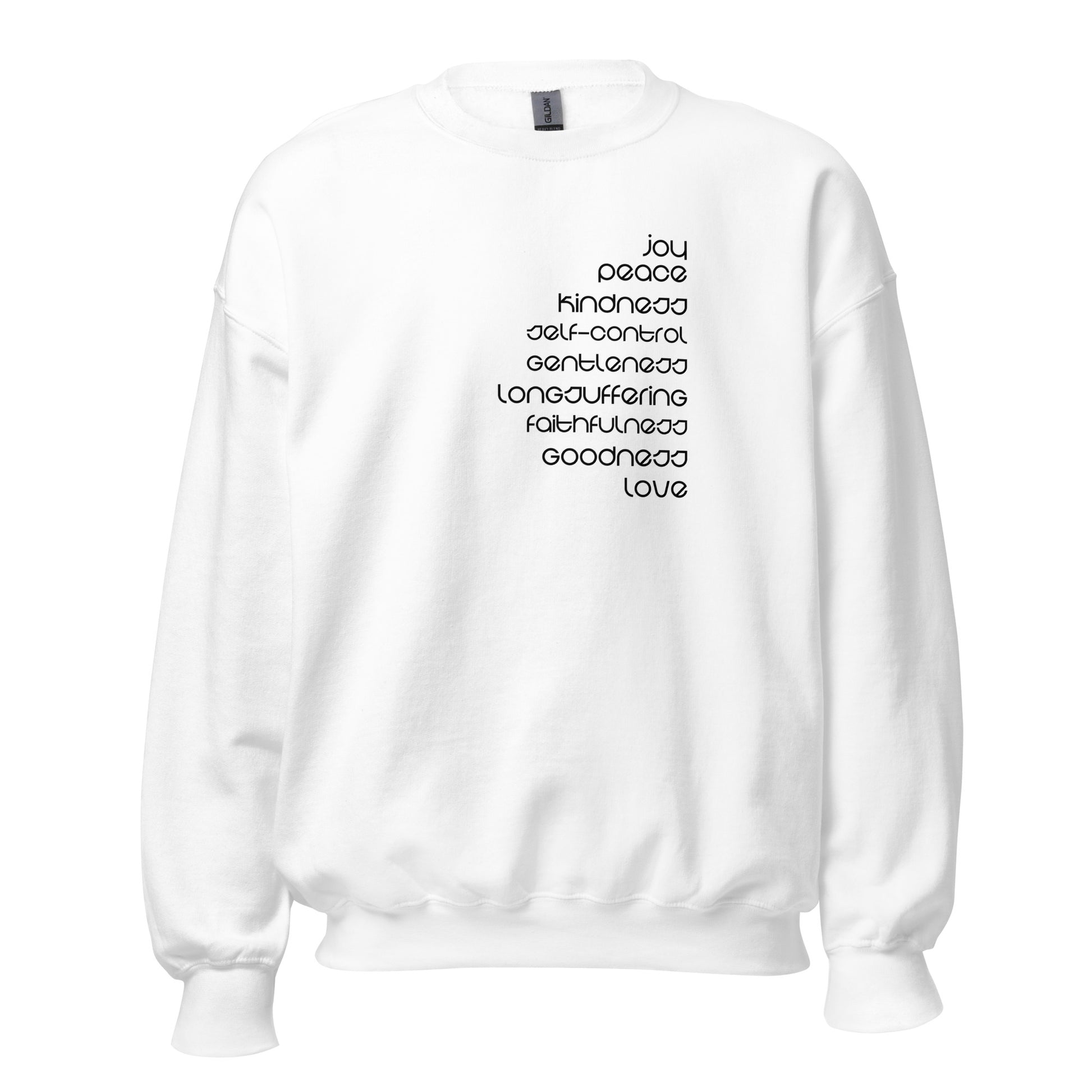 Wrap yourself in the warmth of positivity and faith with this Fruits of the Spirit printed sweatshirt. Crafted with comfort and inspiration in mind, this sweatshirt serves as a daily reminder of the virtues that enrich our lives. Made from premium quality fabric, this sweatshirt offers a cozy yet breathable fit, perfect for both chilly days and warm hearts. Whether you're spending time with loved ones, engaging in acts of service, or simply seeking solace in your faith, this sweatshirt will be your comforting companion. Available in a range of sizes and colors, choose the one that resonates with your spirit and wear it as a symbol of your commitment to living a life guided by love and compassion.